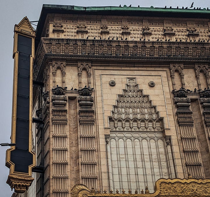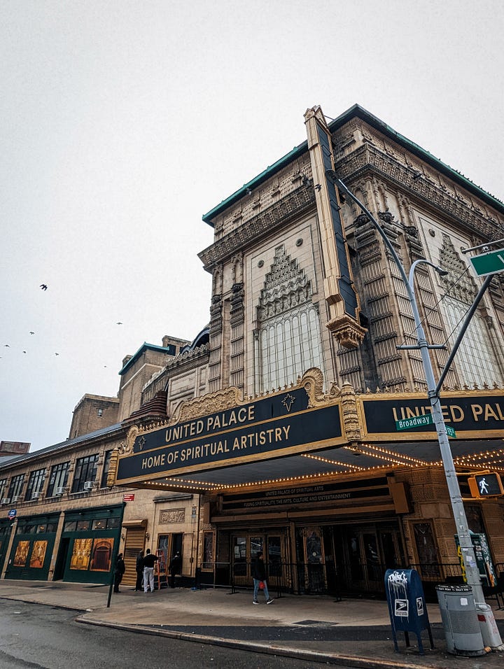 On 175th Street I passed the United Palace – a grand movie theater built in 1930, acquired by the United Christian Evangelistic Association in 1969, and now functioning as a non-denominational “spiritual arts” community.3 I was struck by the building’s eclectic ornamentation, described in the past as “Byzantine-Romanesque-Indo-Hindu-Sino-Moorish-Persian-Eclectic-Rococo-Deco.” We usually associate performance arts and ornate buildings with tourist areas and centers of power (the two often overlap). The section of Broadway “known” for its lavishness is seven miles south of 175th and Broadway. Ornamentation in these settings feels instrumental. It’s designed to impress visitors and impress upon the masses where the centers of power lie. Ornamentation that evokes awe in the middle of the everyday – as the United Palace inadvertently did for me at the end of hour 1, when my adrenaline was waning and energy flagging – feels more special.